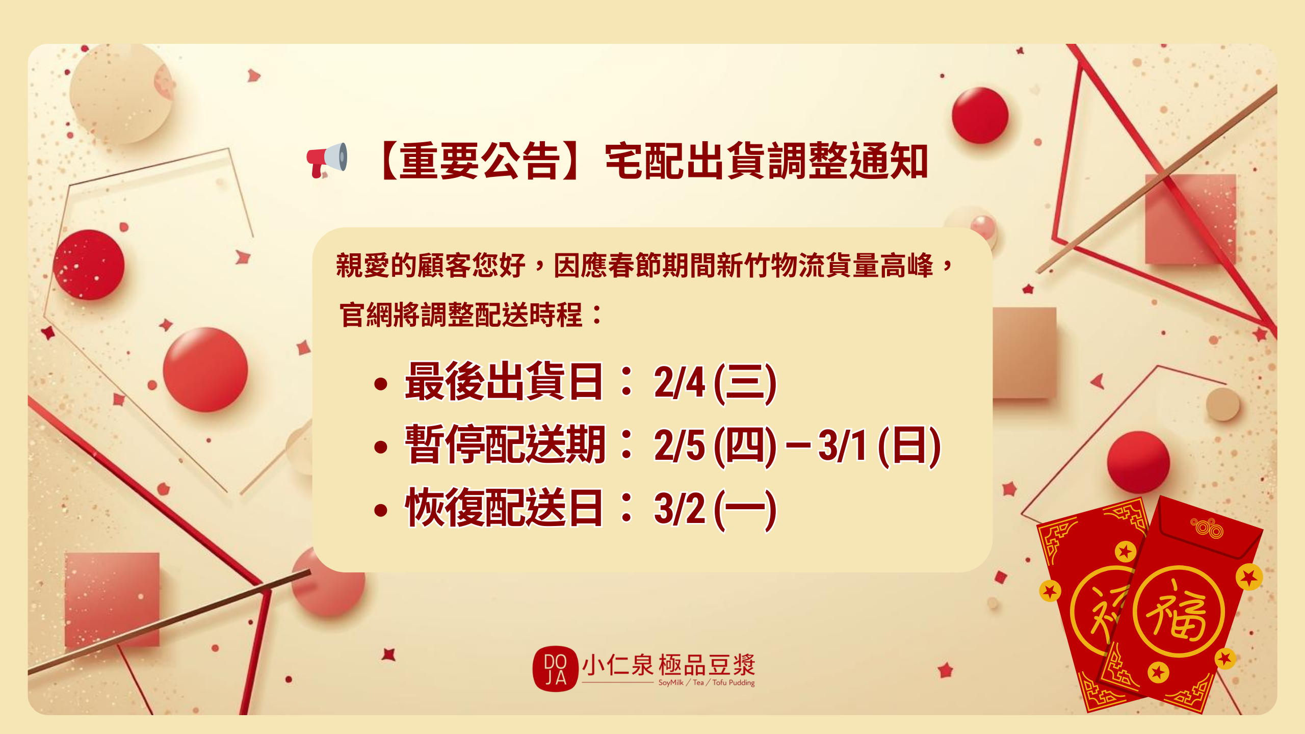 暫停宅配配送期間:2026 年 2 月 5 日(四)至 3 月 1 日(日)
